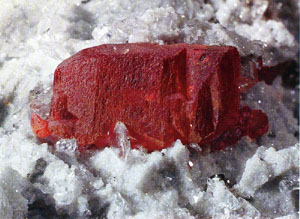 Bild: Realgar mit Quarz auf zuckerkörnigem Dolomit (Foto P. Vollenweider)