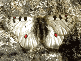 Alpenapollo mit rotem Fleck auf dem Vorderflügel und jeweils 2 roten